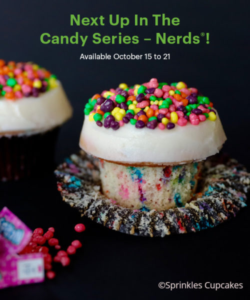 This month, it’s a celebration of candy with Sprinkles’ Candy Series! So from October 15-21, you’ll want to push up your glasses and adjust your suspenders (or maybe just straighten out your Mickey ears!) because Sprinkles has a Nerd Cupcake! This colorful treat features confetti cake, vanilla buttercream, and a coating of crunchy, sugary Nerds!