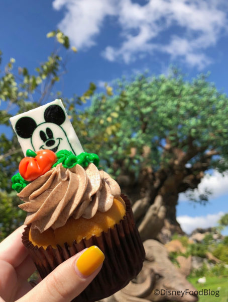 We spotted a new Halloween Cupcake at several locations around the park. This not-to-spooky Mickey ghost-adorned sweet treat was spotted at Creature Comforts and Pizzafari. It’s a combo of pumpkin and cinnamon flavors that we couldn’t resist trying this out. Read our review of this Halloween treat!