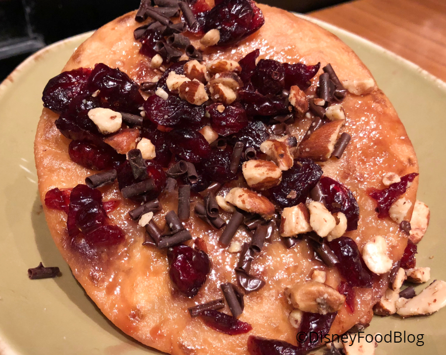 The chocolate, cranberries, and nuts sprinkled atop the freshly-fried tortilla make their way into every bite.