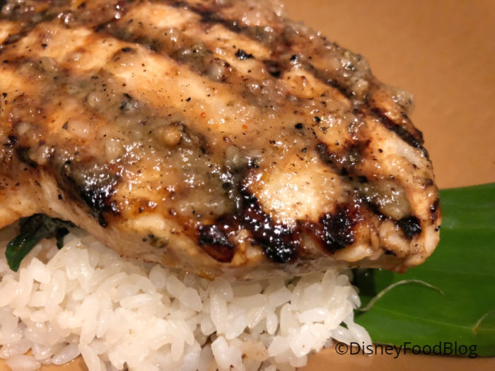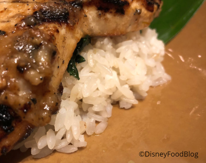 The base of the dish is plantain rice, which, again, serves the purpose of absorbing the sauces and juices from the protein. There’s also some Swiss chard under there.