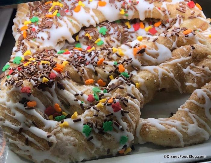 The Pumpkin Pretzel is decorated with fall leaf sprinkles (along with some chocolate), dusted with spices, and drizzled with icing.