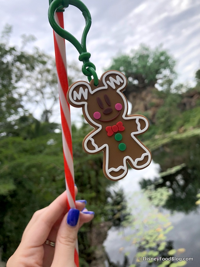 This souvenir straw ($4.00) is swirled to resemble a peppermint stick, and a smiling Gingerbread Mickey is clipped right on!