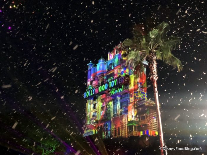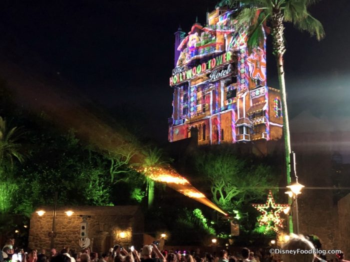 For the second year in a row, The Hollywood Tower of Terror Hotel is transformed every evening with projections featuring holiday scenes.