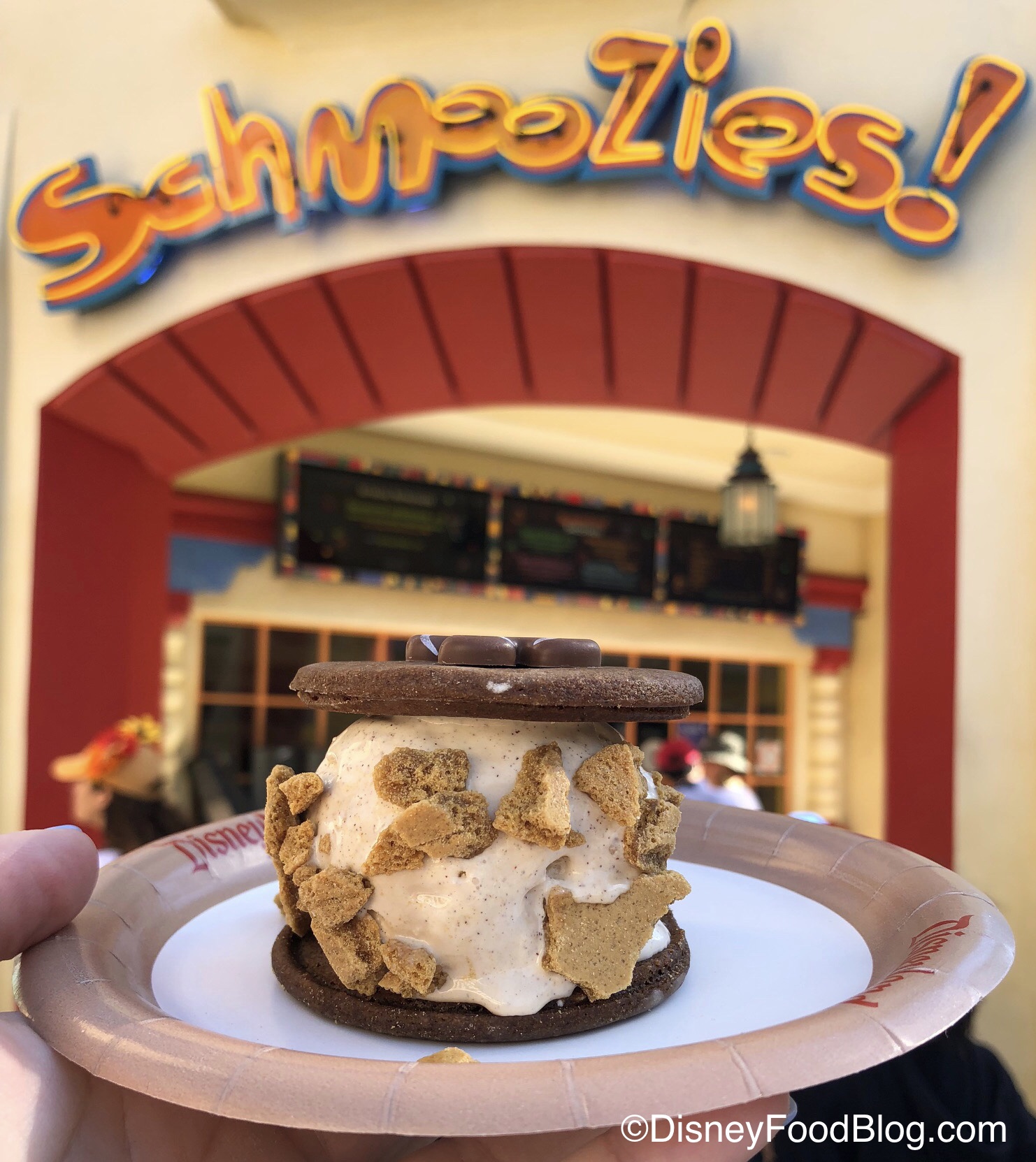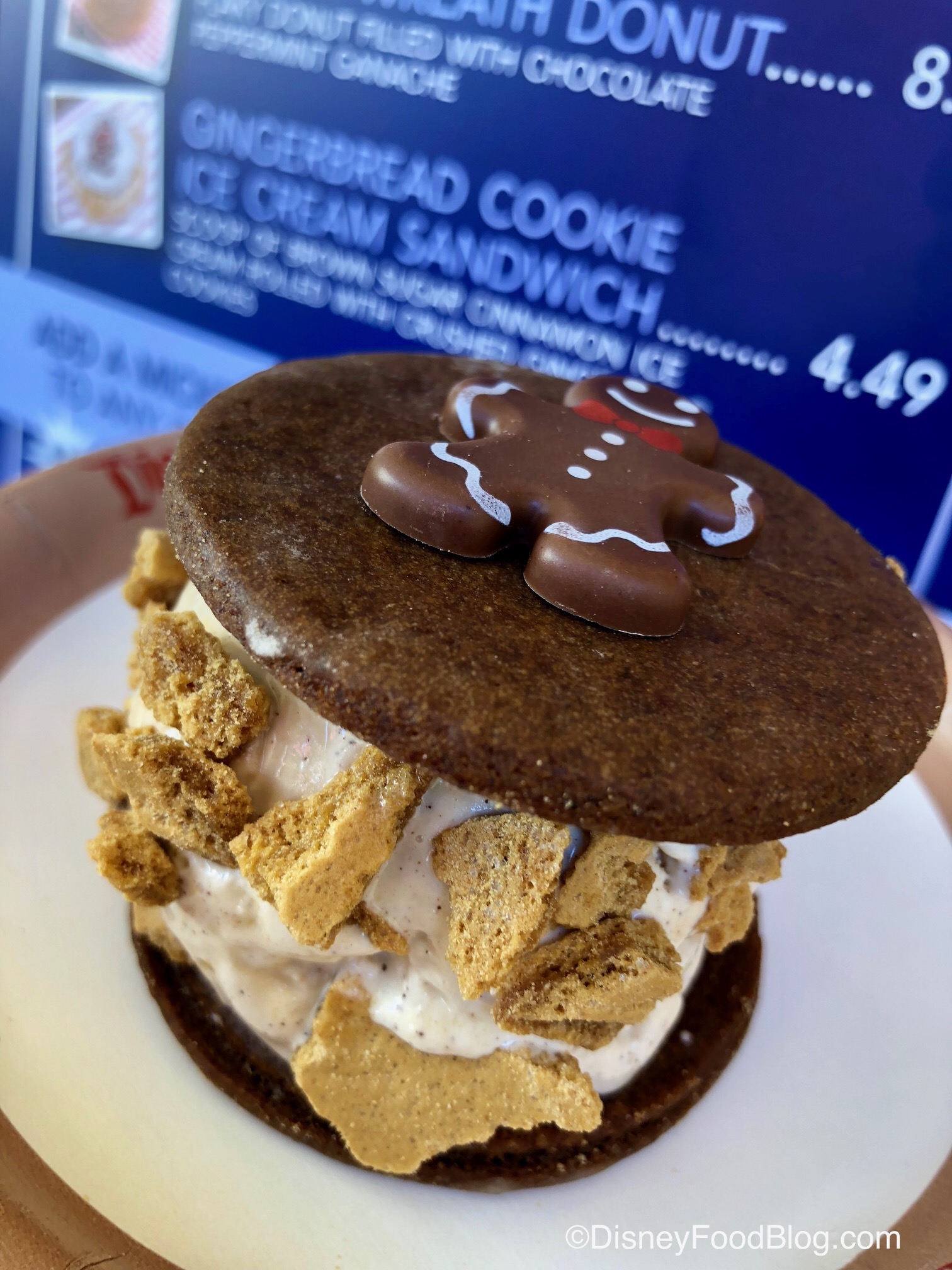 Schmoozies in Hollywood Land just debuted a tasty selection of Christmas-inspired treats and the Gingerbread Cookie Ice Cream Sandwich gets two thumbs up. It’s one of four new seasonal treats added to their menu during Disney’s Festival of the Holidays happening now at Disney California Adventure.