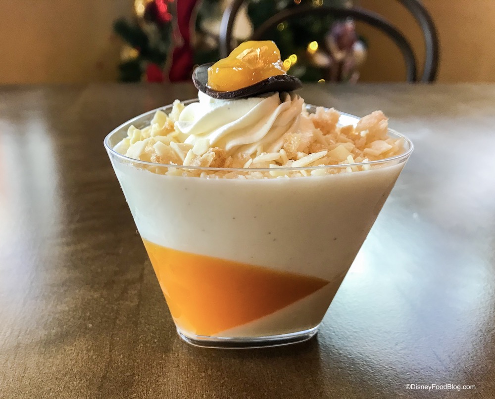 Let’s get to dessert, shall we? The Apricot Peach Verrine features buttermilk panna cotta, apricot peach gelee, and sugared almonds. It’s even topped with a fleck of edible gold! The Apricot Peach Verrine ($8) was part of Amorette’s WonderFALL lineup at Disney Springs, but it’s still here for a limited time.