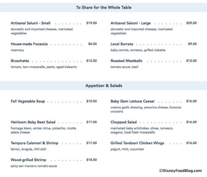 At the time of publishing this post, lunch and dinner menus appear to be the same on the Disney World website, starting with To Share for the Whole Table — which includes Roasted Meatballs — and Appetizers and Salads featuring Tempura Calamari & Shrimp and Grilled Tandoori Chicken Wings.