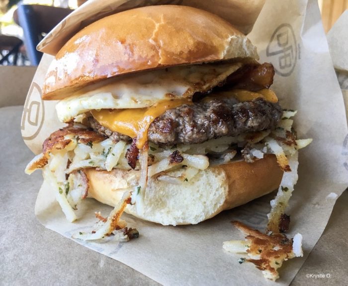 The Breakfast Burger features the D-Luxe signature burger patty, Cheddar, bacon, egg, and hash browns, all on a Parker House Roll. (Sounds amazing, right?!)