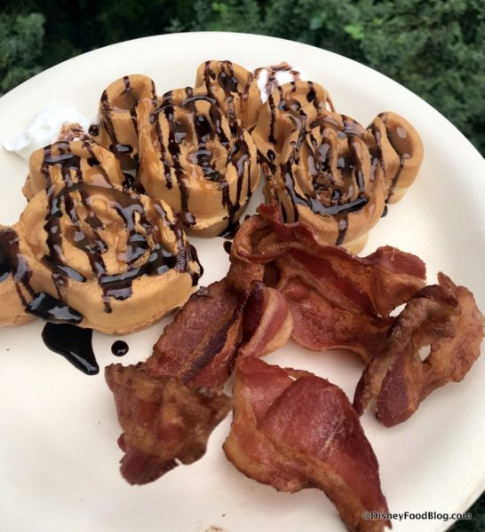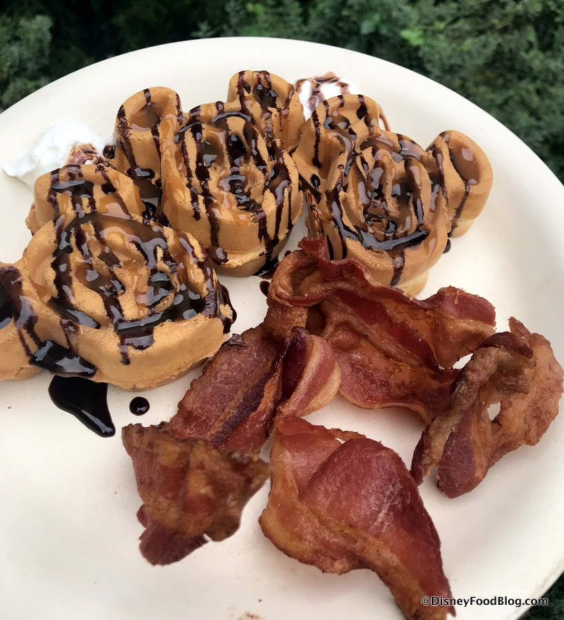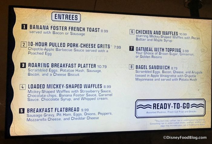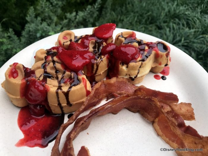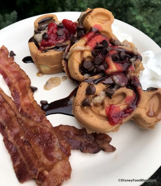 You’ll now see Loaded Mickey-Shaped Waffles on the breakfast menu (which is served from 7:00 AM – 11:00 AM, with Grab and Go options available starting at 6:00 AM). HOWEVER… you’ll want to take note of a change to the menu description, which reads…
