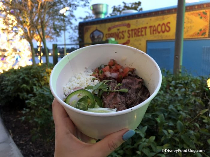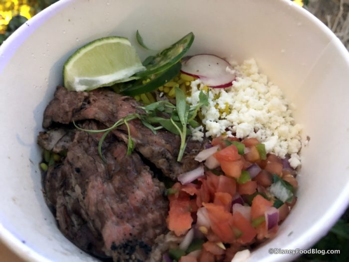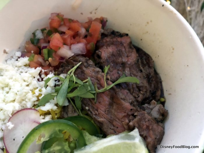 What stands out at Springs’ Street Tacos — and this is typical from our visits to the Disney Food Trucks — is the super fresh quality of the ingredients, giving everything a nice, bright flavor and zip. The Steak Bowl is no exception.