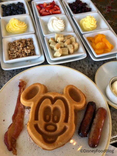 If you opt for a (Disney) traditional Mickey Waffle or Pancakes, you’ll be offered the choice of adding on some toppings and a specialty syrup for $3.50. And, well, you know me and toppings/sauces: GET ‘EM ALL. Sooooo I ordered all three of the topping options to go with my Mickey Waffle!