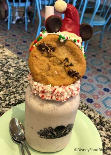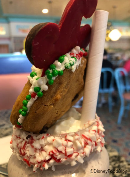 Oooohhh, yeah! Merry Holidays to us! This Santa-worthy shake is Cookies-and-Cream Ice Cream, a Chocolate Chip Cookie Sandwich filled with FROSTING, crushed Candy Cane around the rim, and a Chocolate Mickey Santa Hat piece on top.
