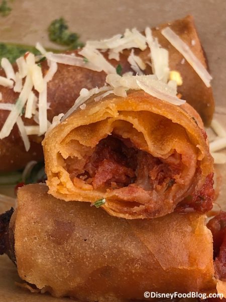 - Pepperoni Pizza Egg Rolls with Marinara and Pesto Sauce – $7.00