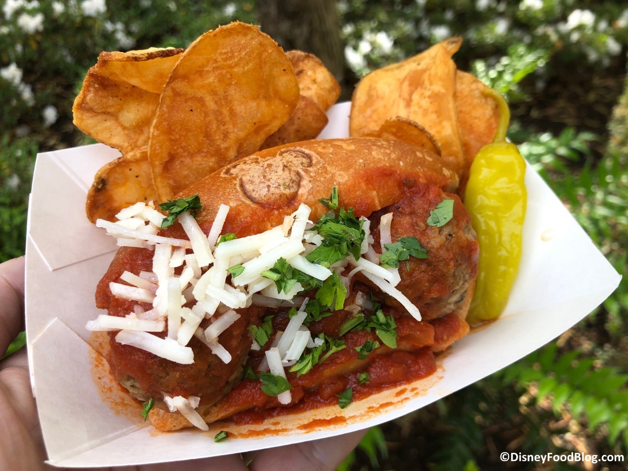 Impossible No “Meat” Ball Submarine with Marinara Sauce topped with Soy Cheese and served with Kettle Chips