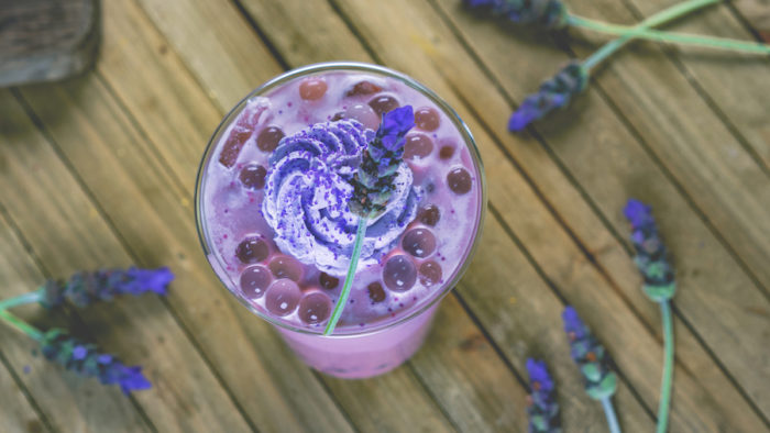 Lavender Milk Tea with lemon popping pearls, purple whipped cream, and lavender sugar