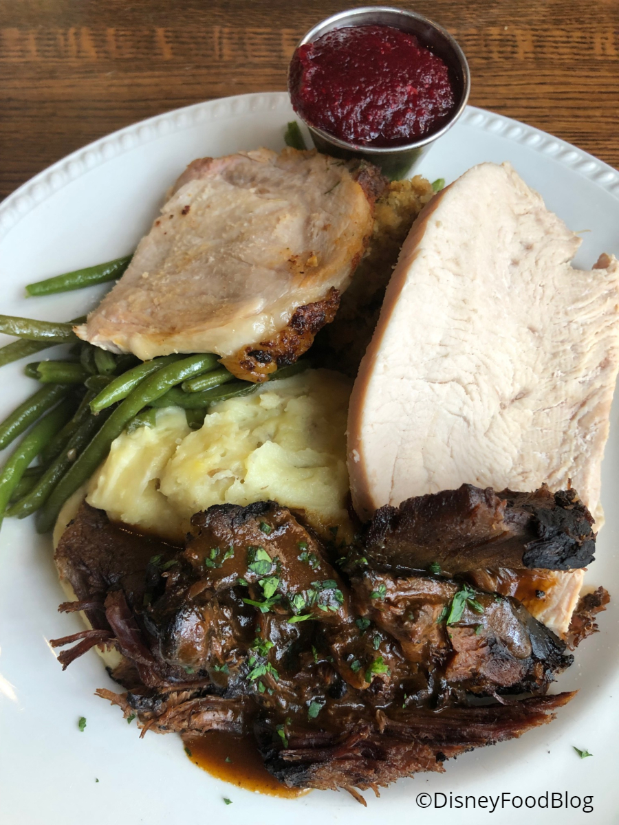 The Patriot’s Platter consists of Roasted Turkey, Oven-Roasted Pork, and Pot Roast. Sides include mashed potatoes, seasonal vegetables (green beans! yum!), stuffing, and mac and cheese.