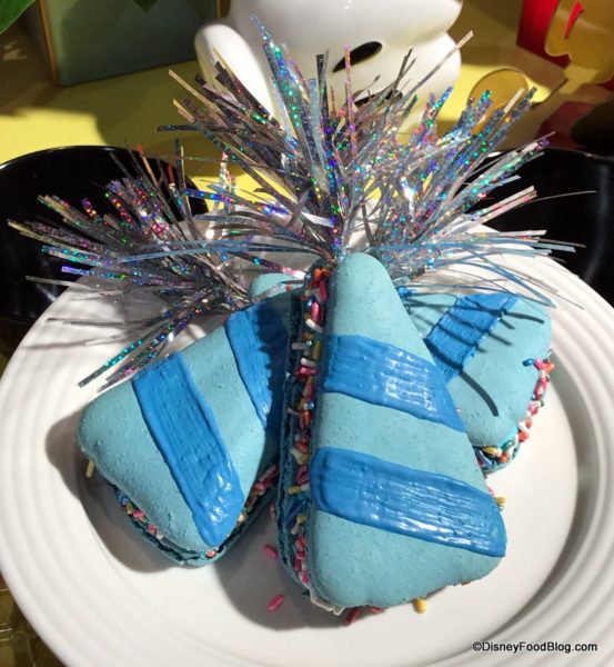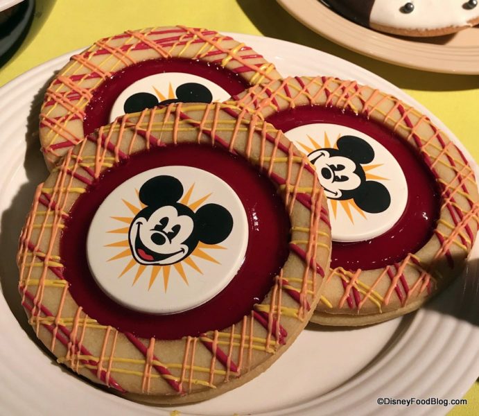 - Celebration Cookies – One sugar shortbread cookie filled with raspberry jam and two sugar shortbread cookies filled with dulce de leche and topped with a chocolate Mickey celebration logo