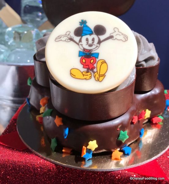 - Mickey’s Birthday Sundae – Frozen yogurt with fruit popcorn, birthday cake cotton candy, candied chocolates, and colorful celebration cake