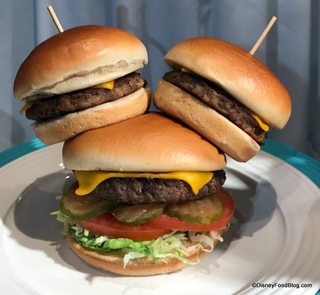 - Mickey-inspired Cheeseburger — 1/3 lb. Angus patty with burger sauce and lettuce on a red potato bun with black sesame seeds