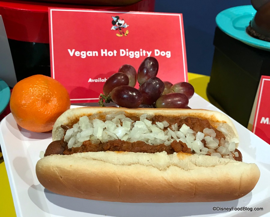 - Vegan Hot Diggity Dog – Vegan hot dog topped with spicy lentil chili, onions, and mustard served with seasonal fruit