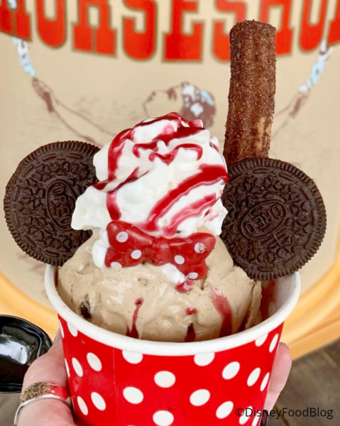 At Golden Horseshoe in Disneyland’s Frontierland, the Minnie-Inspired Sundae features espresso chip gelato (must be how she’s so energetic all the time!), cherry compote, Oreo cookies, and a chocolate-dusted churro!
