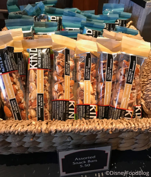 Packaged snacks include Assorted Snack Bars (Kind Bars on Heather’s visit).