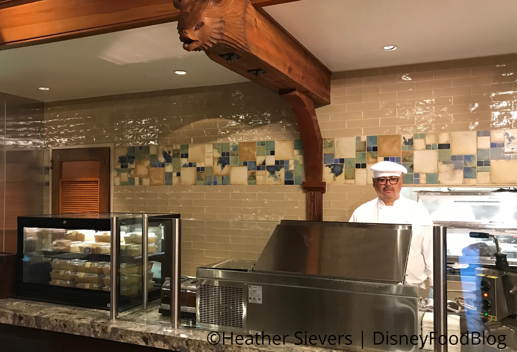 Some of the food prep and assembly is done in this stylish on-stage area. We love the colorful tile, and the bear carving in the beam is kind of epic. 😉