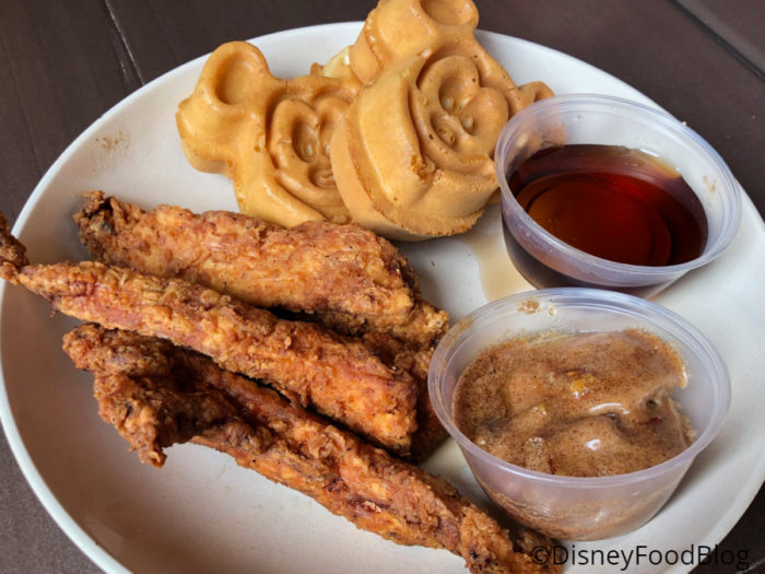The chicken here is flavorful, crunchy chicken tenders — and they. are. awesome. So much flavor in the breading, including prominent black pepper. These are not your average Disney chicken tenders; they’re a step above for sure.