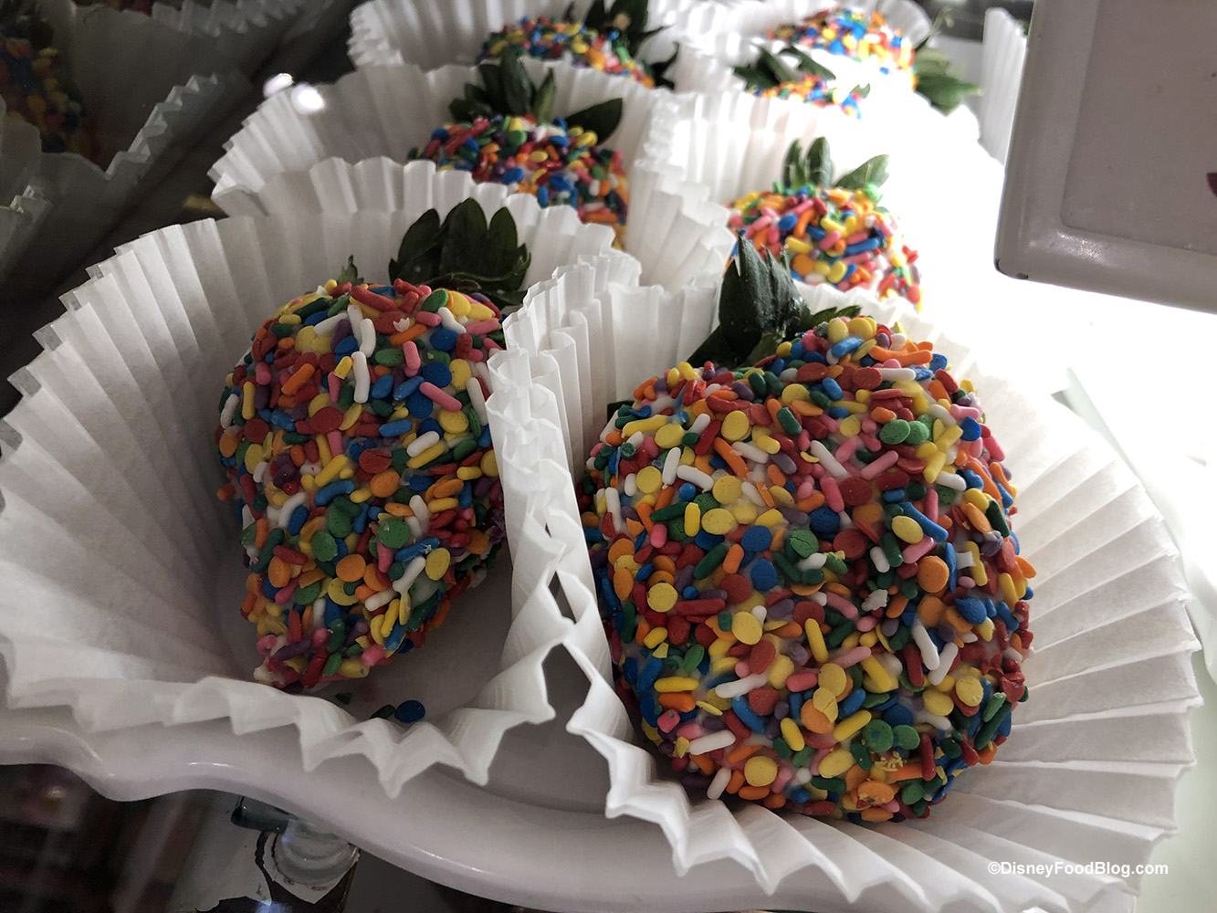 The Main Street Confectionery is getting in on the celebrations with and for Mickey and Minnie with festive looking Celebration Sprinkled Chocolate Covered Strawberries.