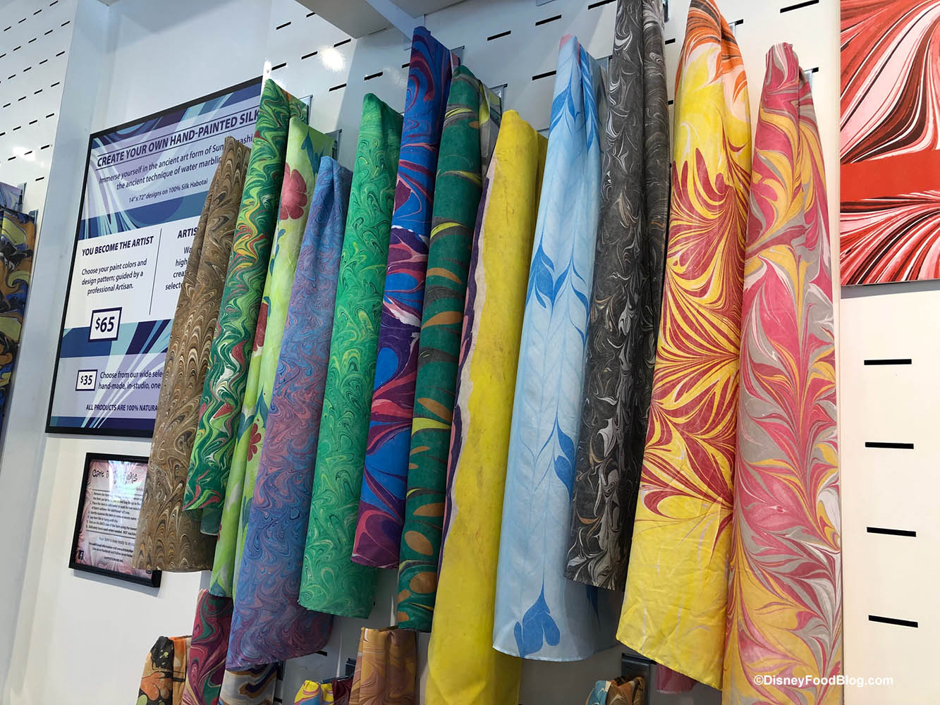 If you’ve been to the Epcot Festival of the Arts you may have seen this fun way to decorate fabric there. There’s an area of the Art Corner dedicated to Artistic Marbling.