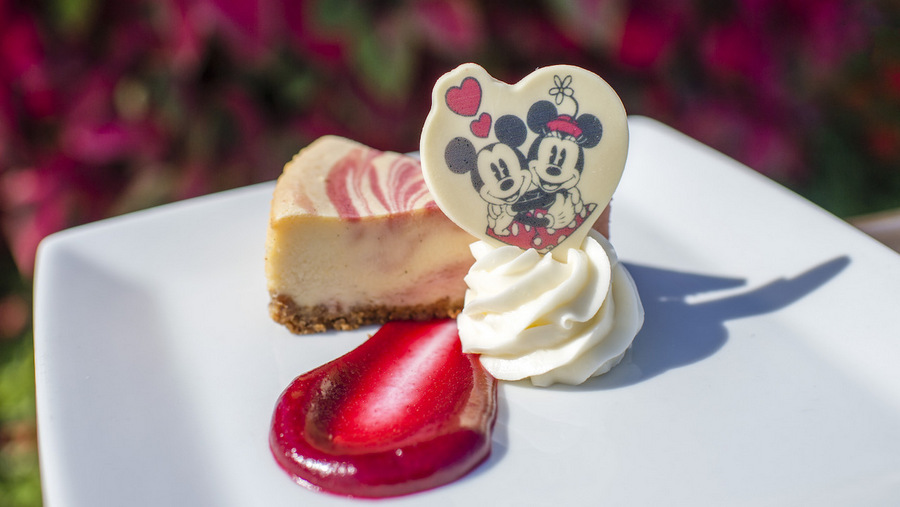 Available through Feb. 15; Strawberry-vanilla marble cheesecake with raspberry drizzle, whipped cream, and a Mickey and Minnie chocolate piece