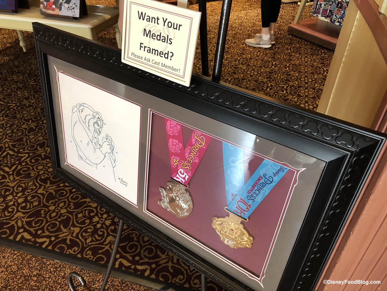 If you are running in the Disney Princess Half Marathon races this weekend and are looking for a way to display your finisher medals, Disney is ready to help! The Main Street Cinema Art Shop had two different framing options on display. Good luck to all of the runners this weekend! Be sure to check out all of the Disney Springs locations offering runners a discount this weekend!
