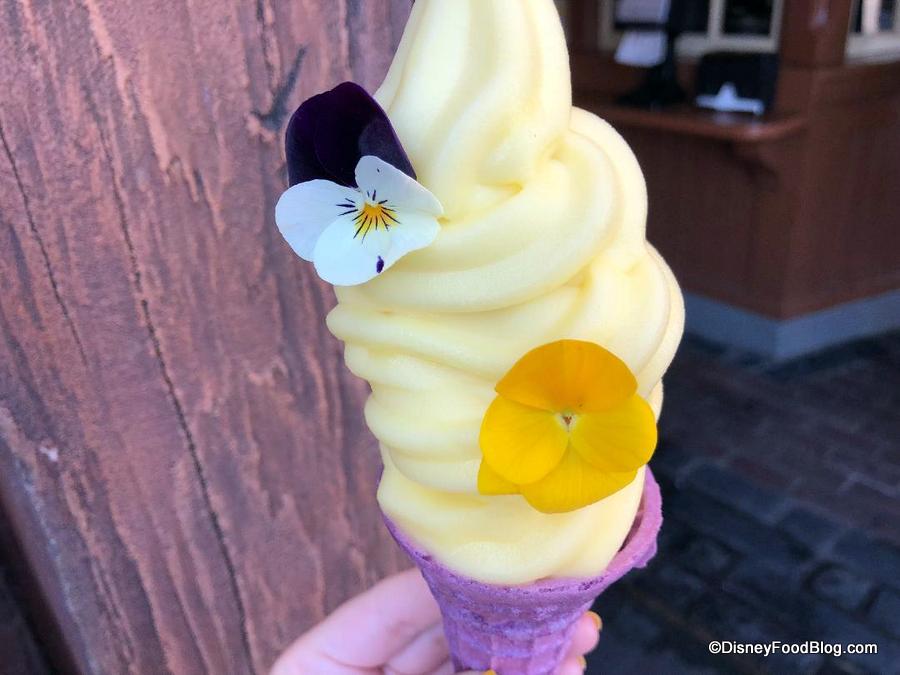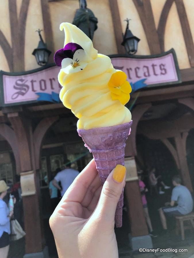 But what makes this cone especially unique, visually, are the edible flowers which garnish the soft serve to mirror the flowers that decorate Rapunzel’s braided hair.