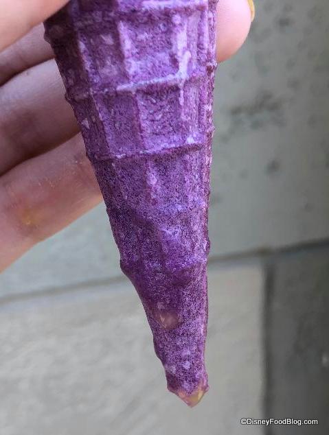 Rapunzel’s signature dress color, purple, is reflected in the color of the cone. It’s filled with lemon soft-serve (Dole Whip!) to mimic the piles and piles of Rapunzel’s blond hair.