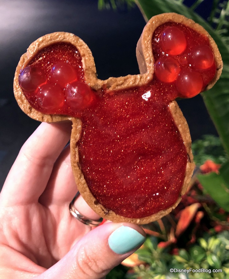 Let’s start at Flavor Full Kitchen with a Mickey-shaped treat — Mickey Tart Peanut Butter Mousse with Strawberry Jam and Boba Pearls. Although there’s a strong peanut butter and jelly flavor here, this one isn’t just for kids.