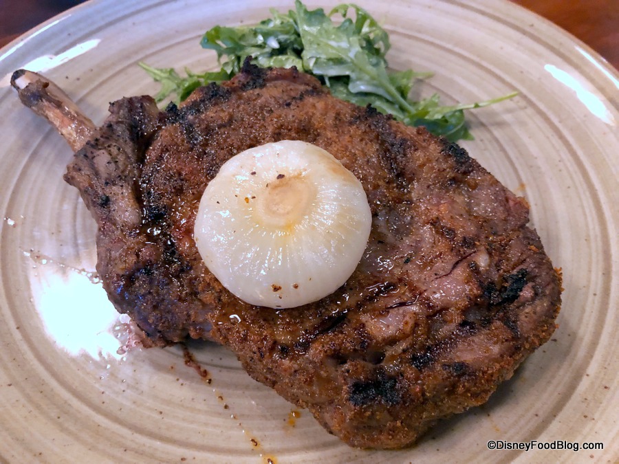 The big ticket items at Kona Cafe are found on the Dinner Offerings where the 20-oz. Bone-In Black Angus Ribeye comes in at $55! (If you’re on the Disney Dining Plan, this is a big value for you… except you’ll likely need to order a side.) The ribeye is a beautiful cut of meat, and the grill marks and visible seasoning are really compelling. Arugula and a braised cipollini onion are the only accompaniments, and they’re definitely more garnish than side dish.