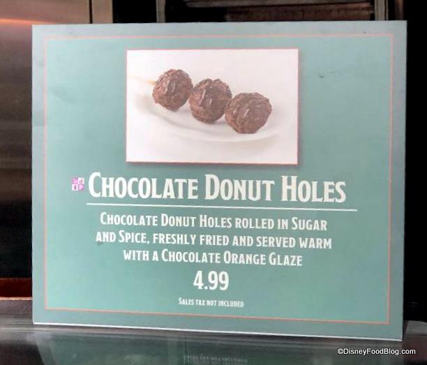 The three Chocolate Donut Holes are rolled in sugar and spice, then fried. But the finishing touch of chocolate-orange glaze is MUCH more impressive in person than as it appears pictured on the sign.