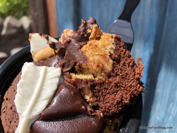 This treat is indeed tasty. In fact, the only way this could be improved is if it were served warm. Logistically that wouldn’t work with the cold chocolate feather topper and maybe even due to the fact that it’s sold from a popcorn cart as opposed to a regular counter service location. But if this were to be added as a regular item — say, in Big Top Treats, perhaps? — serving it warm would definitely make this one a must-get!