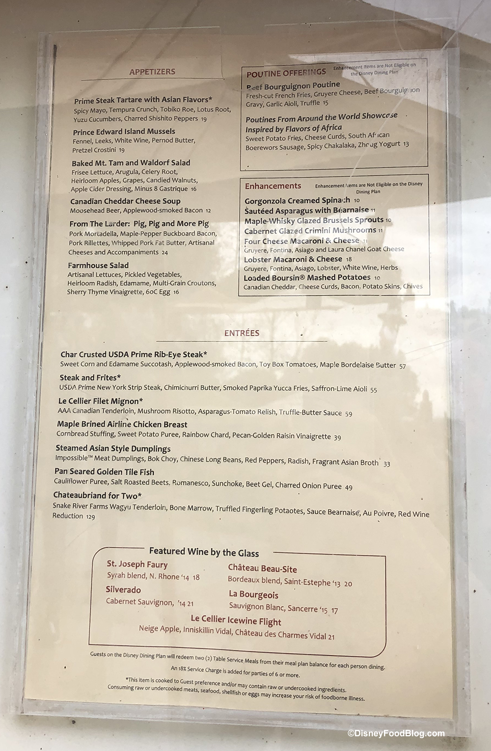 In addition to the construction in this changing pavilion, you’ll also find changes at Les Chefs de France. A new Assiette du Pecheur replaces the Assiette de la Mer Florentine, Canard a la Orange replaces the Canard aux Cerises, and there is a new Filets de Truite Grenbloise. Bon Appetit!