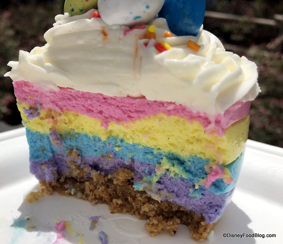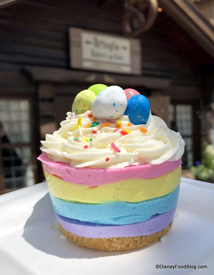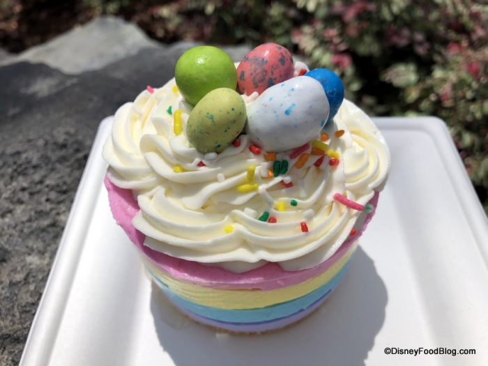Now, you’ll currently find this labeled simply as the Specialty Cake (available for $5.99 or a Disney Dining Plan snack credit), but the chocolate egg candies on top and cheerful spring pastels let you know this is a seasonal offering for spring.