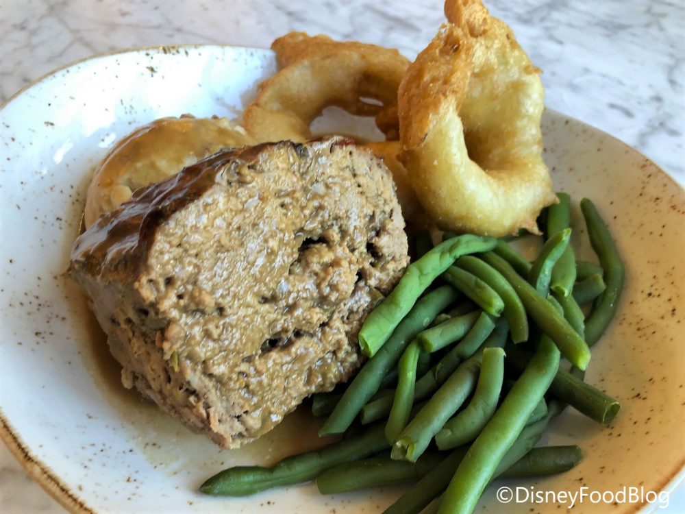 The Home-style Meatloaf is served with red-skinned mashed potatoes, crispy onion rings, and a seasonal veggie, which was green beans for us!
