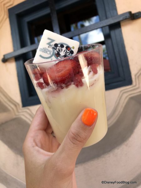 The 30th Anniversary Tres Leches Verrine is available for $4.99 (or a Disney Dining Plan snack credit) at Fairfax Fare.