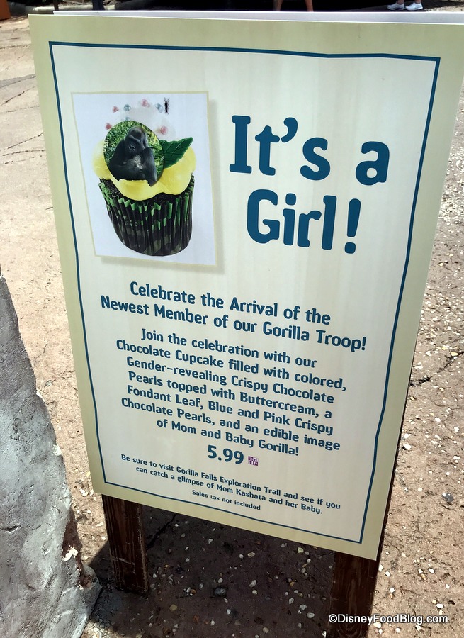 Grace (named after the GRACE gorilla sanctuary in the Democratic Republic of Congo) was born on May 1st, and Disney was happy to announce that both she and her mother, Kashata, are doing well. And for a limited time at Tamu Tamu Refreshments in the park’s Africa, you can celebrate Grace’s arrival with the “It’s A Girl” Cupcake!