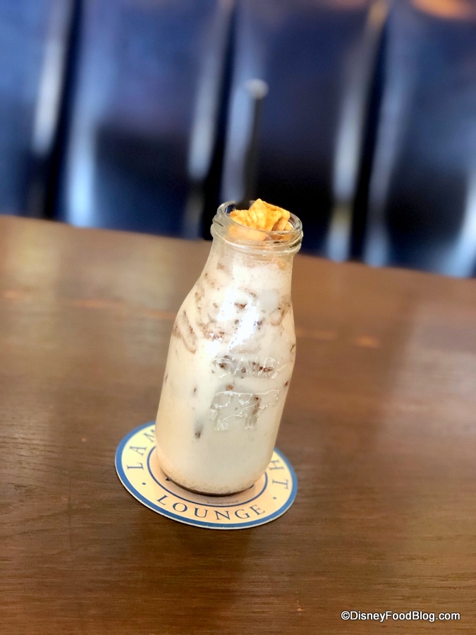 The components include Stoli Vanilla Vodka, Frangelico, Rumchata, and Cinnamon Cereal-Infused Milk — but there’s also a bunch of Cinnamon Toast Crunch cereal mixed in there, too. It was super fun to drink, like sipping milk from the bottom of a cereal bowl, but with a buzz. 😉