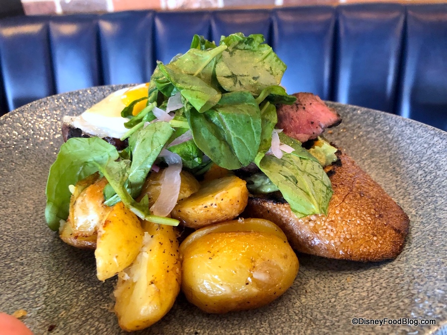 I tried several dishes on the brunch menu, including three savory entrees. First up is a trendy food done gastro-pub style: New York Avocado Toast. Crisp, grilled Sourdough Bread forms the foundation for Avocado Mash, New York Steak, a Sunny-Side-Up Egg, Arugula Salad, Piquillo Butter Sauce, and Pickled Onions.