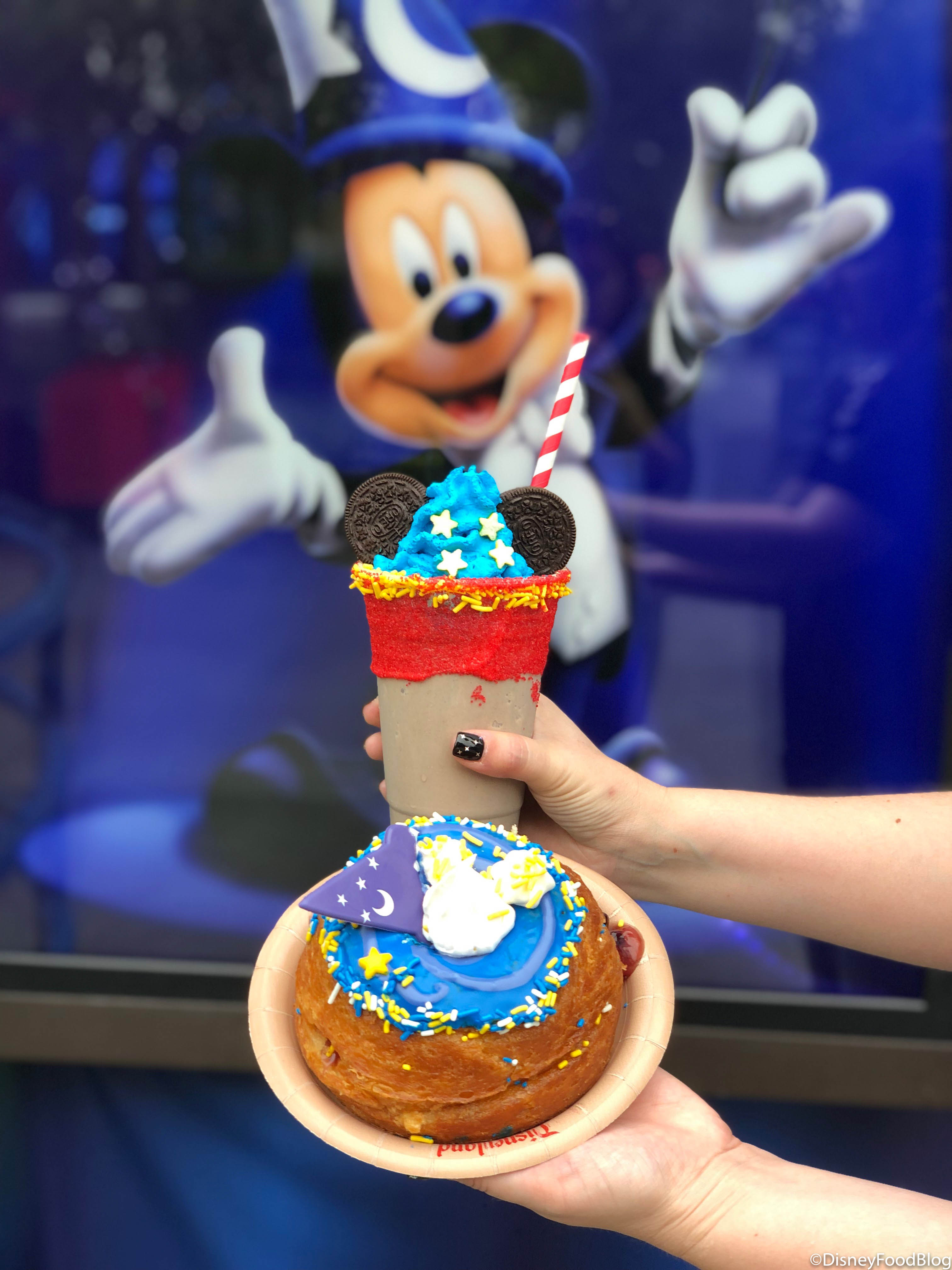 The Sorcerer Mickey Shake is a cookies and cream shake topped with blue whipped cream and chocolate cream-filled cookie ears. The shake tastes just like the Cookies and Cream Get Your Ears On Shake that just ended its run (so, basically YUM!)! Check out our full review here.