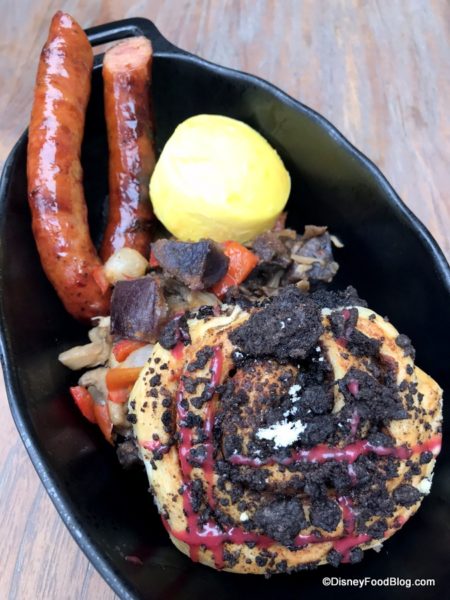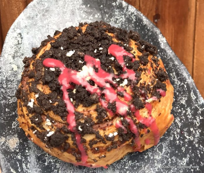 The Mustafarian Lava Roll is a sweet breakfast treat — basically a spiral of puff pastry topped with oreo crumbles and icing and stuffed with chocolate mousse according to the menu. But I thought I tasted cinnamon in there. Maybe just because it looks like a cinnamon roll and feels like a cinnamon roll, so… . Note that our lava roll was served cold at Docking Bay, but warm at Oga’s Cantina, so I’m not sure what the protocol is at Black Spire Outpost in general. It’s much better when it’s warm.