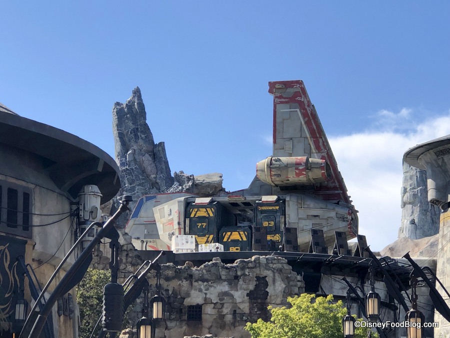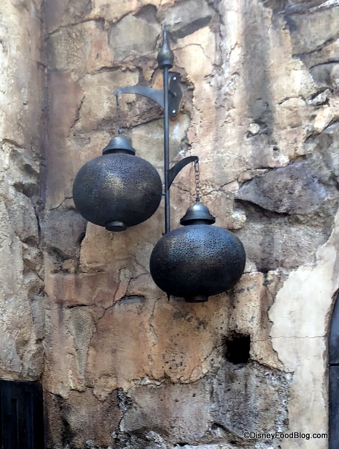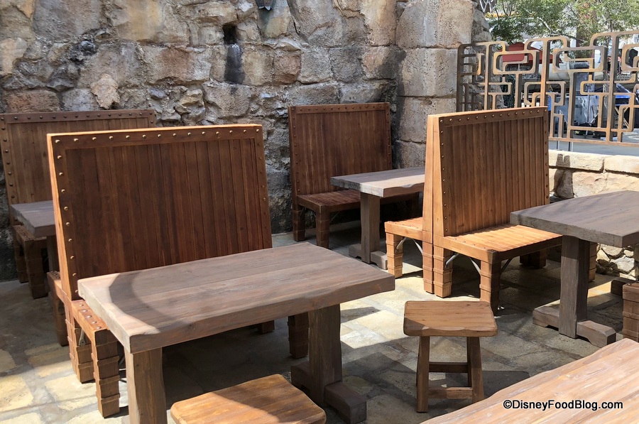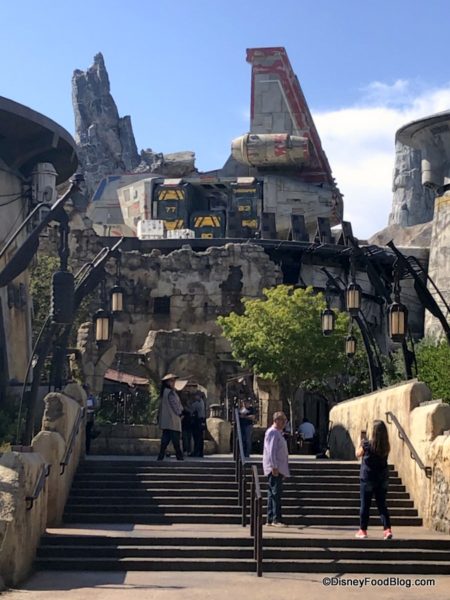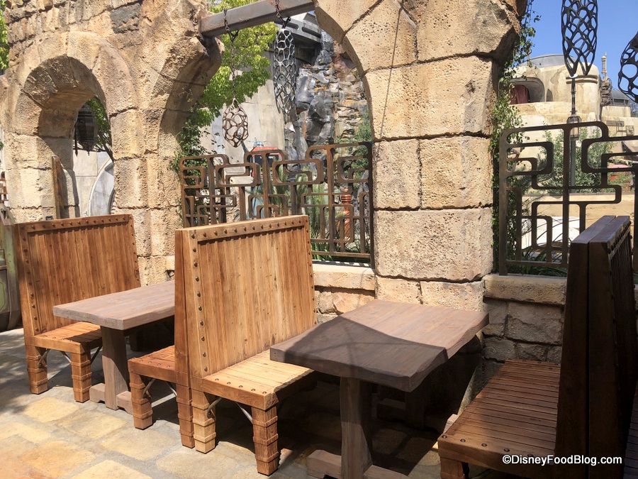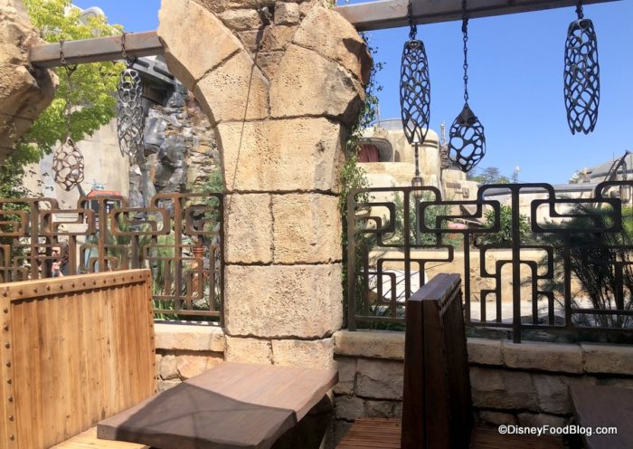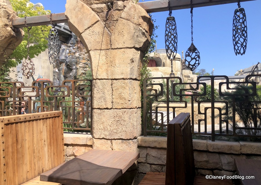 The word you’re searching for is “wow”. The Stone outcroppings in the background juxtaposed with the tan tones of the restaurant are something special. This is easily one of the loveliest spots we found in Galaxy’s Edge, and we can see it becoming a go-to place to escape. Not gonna lie: if they had alcohol at Docking Bay, this would be a terrific beer garden (or cocktail garden… that’s a thing, right?).