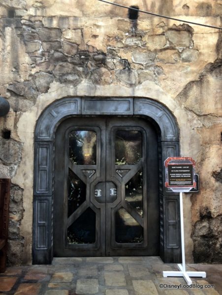 Another recognizable feature of the restaurant’s roofline is a large circular dome, so when you’re hunting for Docking Bay 7, be sure to look for these characteristics. Docking Bay, as with most other landmarks in Black Spire Outpost, does not have a sign in English labeling the entrance to the restaurant. You’ll need to scan the symbols above restaurant and shop entrances to confirm that you’ve found the right place (you’ll need your Datapad for that — click here to learn more!), but with Docking Bay 7, if you see a transport shuttle on the roof, you’ve arrived. 😉