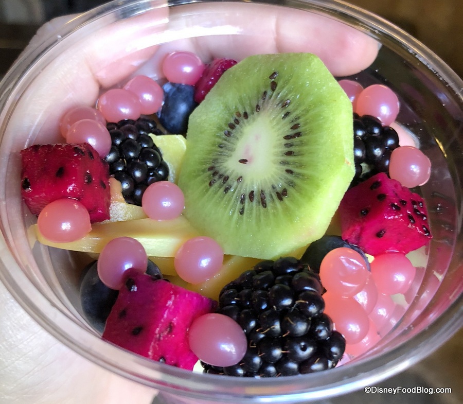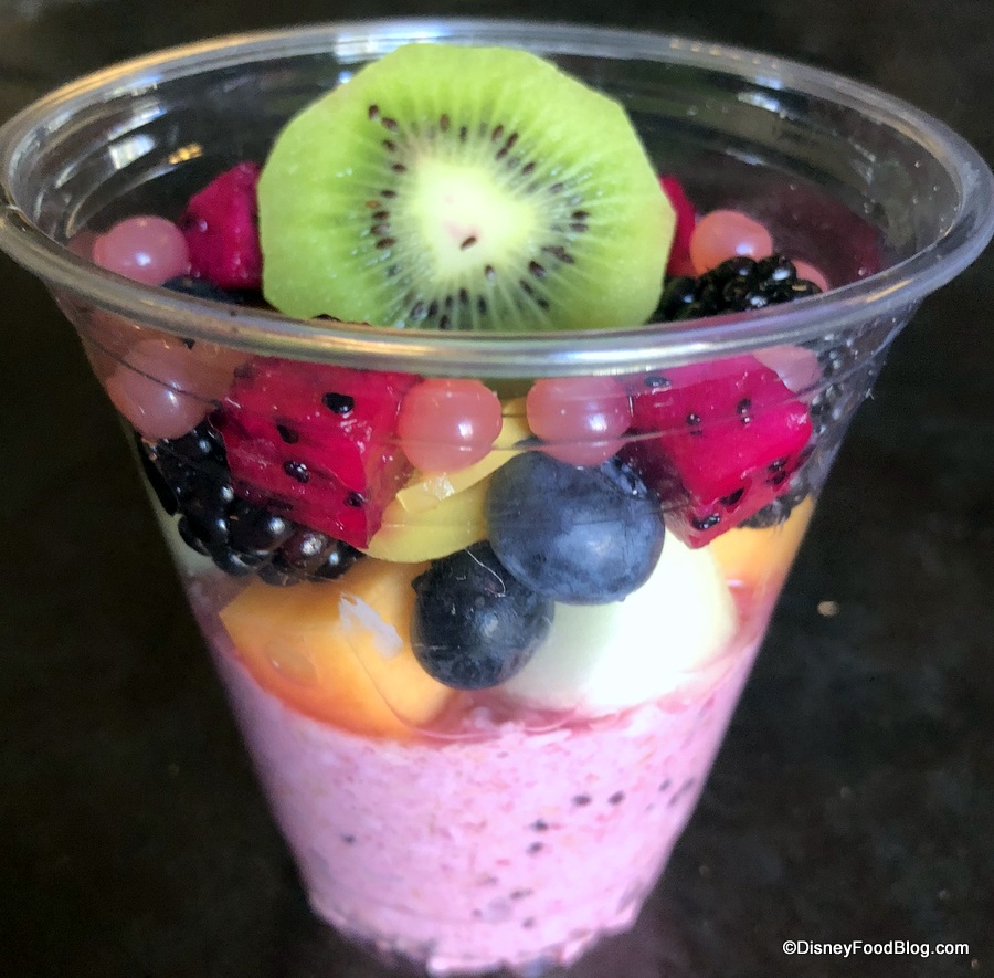 The oats are pink in color due to the dragon fruit juice. And the ratio of fruit to oats is a little heavier on the fruit. Seasonal fruit on our visit consisted of blueberries, melon, mango, and kiwi. And because it’s Disney, there are some strawberry popping pearls on there, too.