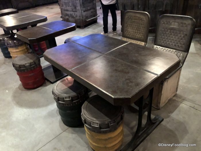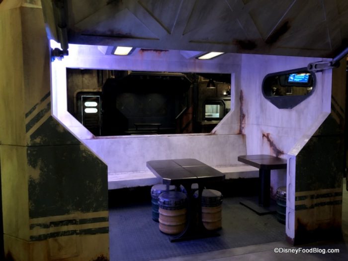 The seating area at Docking Bay is to the left of the entrance, and the decor here is essentially the same as we see everywhere in Galaxy’s Edge: industrial on top of industrial — but with subtle pops of color, including colorful uplights.